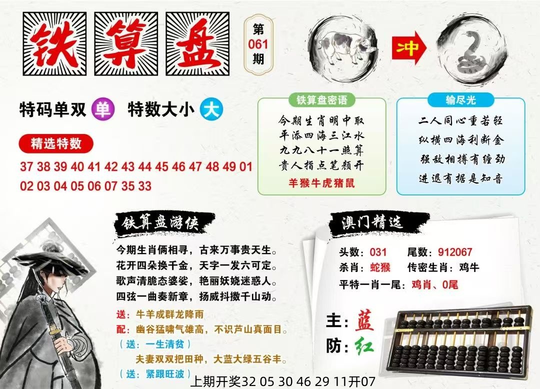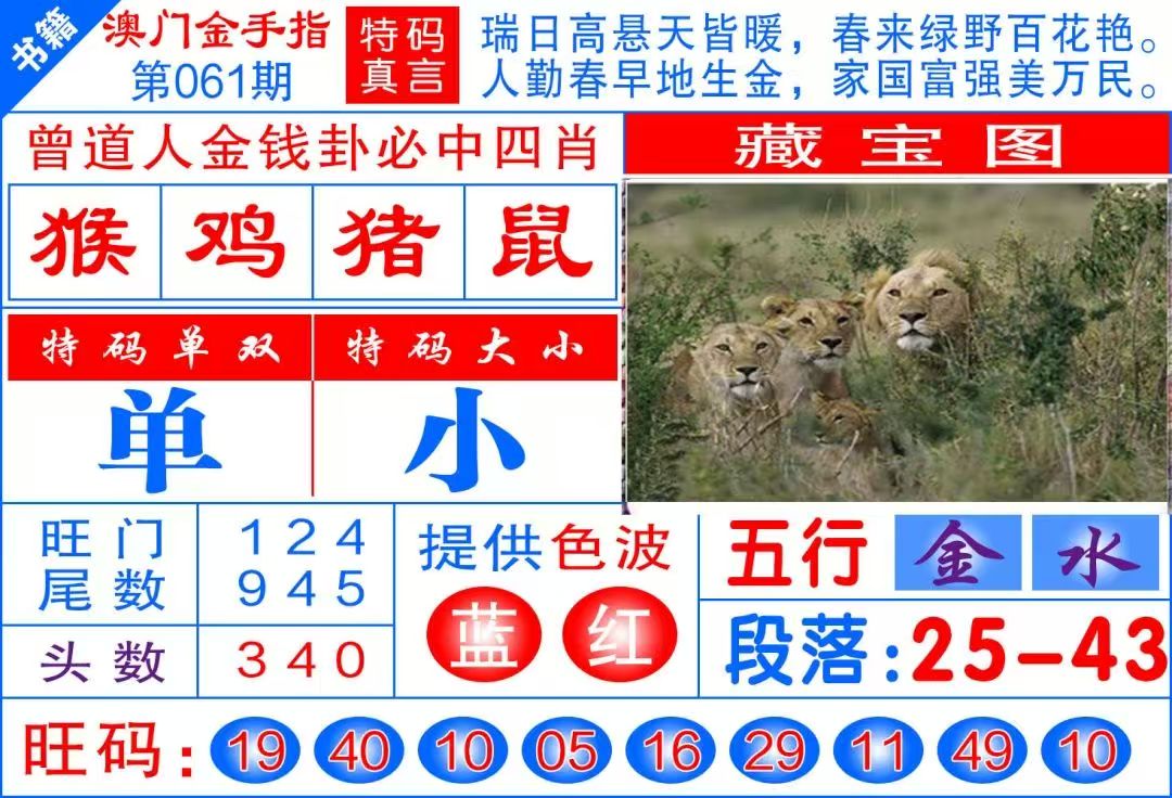 | 061期:九肖 | 猴狗蛇虎羊马鸡兔牛 | 开:准00 |